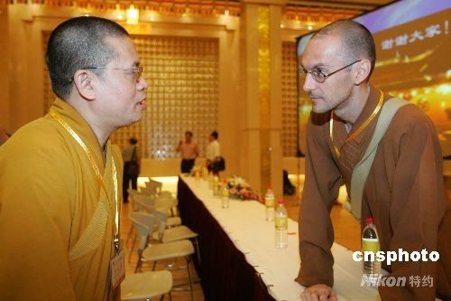 來自臺灣佛光山的新西蘭籍慧峰法師在今日“二00八佛教外語交流會”百余位與會僧眾中略顯特殊。這位高鼻梁、藍眼睛的年輕僧侶,不僅說著一口流利的中文,且談起佛法來頭頭是道;鄯宸◣燁H為執(zhí)著地一再申明,“身為出家人,我更愿意聽到人家稱呼我的法號‘慧峰’,而不是俗家的英文名字。”