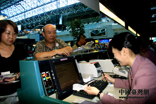 機(jī)場工作人員認(rèn)真熱情地為陸客辦理登機(jī)手續(xù)(攝影:李徽)