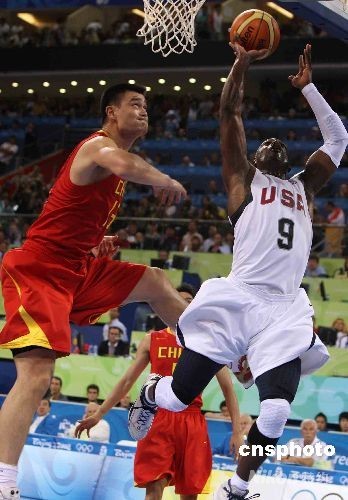8月10日晚,北京奧運(yùn)會男子籃球中國隊(duì)與美國“夢八隊(duì)”之戰(zhàn)在五棵松籃球館舉行,中國隊(duì)的超級中鋒姚明防守NBA球星韋德得上籃。 中新社發(fā) 任晨鳴 攝