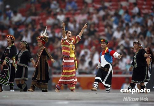 8月8日,第29屆夏季奧運(yùn)會(huì)在北京奧林匹克公園內(nèi)的國(guó)家體育場(chǎng)“鳥巢”舉行。來自臺(tái)灣的高金素梅文化團(tuán)隊(duì)在“鳥巢”表演“我們都是一家人”歌舞。 中新社發(fā) 杜洋 攝