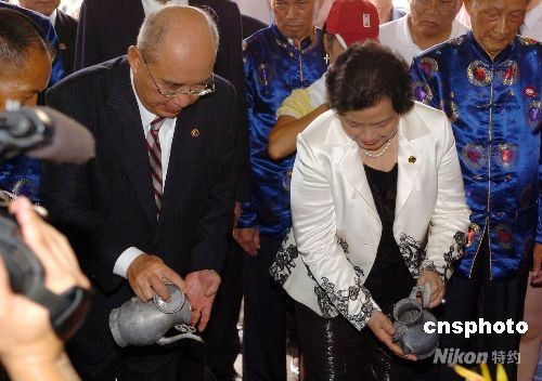 8月14日,中國國民黨主席吳伯雄夫婦時隔8年,第2次回到祖籍地——福建永定縣下洋震思賢村謁祖,在有著500多年歷史,奉祀開基祖吳綱公的吳氏宗祠里舉行了一個簡短而隆重的祭祀儀式。圖為吳伯雄夫婦在宗祠里灑酒,向祖先表示祭奠。 中新社發(fā) 游慶輝 攝