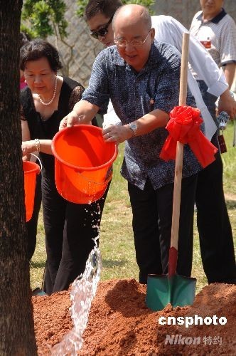 八月十四日下午,中國國民黨主席吳伯雄一行在福建永定縣高北土樓群的“土樓王”承啟樓前,植樹紀(jì)念此次祖地行。圖為吳伯雄夫婦為新種下的香樟樹澆水。 中新社發(fā) 鄭祚聲 攝