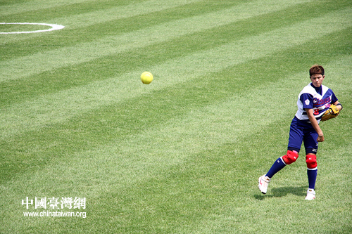 中華臺(tái)北隊(duì)女壘隊(duì)員拋球(攝影 李徽)