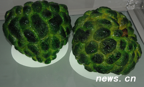 琉璃制作的臺(tái)灣水果釋迦。在臺(tái)灣“祥云小屋”,用琉璃制作的水果栩栩如生,令人驚嘆。 新華網(wǎng) 前衛(wèi) 攝