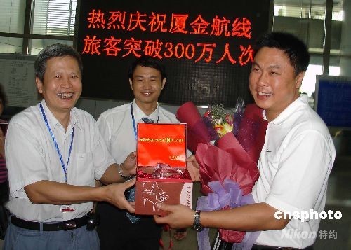 九月十九日,于二○○一年一月二日正式開通的廈金航線,累計運送出入境旅客人數突破三百萬人次。廈門市臺辦、廈門口岸查驗部門,向幸運成為第三百萬名出入境旅客的在廈臺商賴怡全(右)贈送精美紀念品,并獻上鮮花。 中新社發(fā) 楊伏山 攝