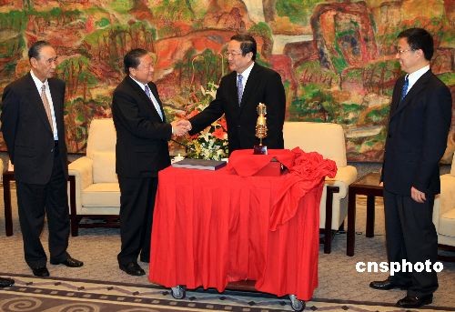11月6日晚,中共中央政治局委員、上海市委書記俞正聲(圖右二)與市委副書記、市長韓正(右一)在上海西郊賓館會見了臺灣大企業(yè)董事長參訪團一行 該參訪團由臺達集團董事長鄭崇華、國泰世華銀行董事長汪國華、遠東集團董事長徐旭東、英業(yè)達集團董事長李詩欽等“重量級”臺商組成。會后,俞正聲與韓正向臺灣大企業(yè)董事長參訪團贈送了神舟七號飛船實體模型和神舟七號航天郵品等紀念品。 中新社發(fā) 湯彥俊 攝