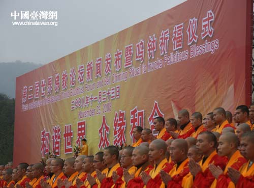 中國(guó)臺(tái)灣網(wǎng)11月24日無(wú)錫消息 昨天上午,第二屆世界佛教論壇新聞發(fā)布暨鳴鐘祈福儀式在無(wú)錫靈山舉行。中國(guó)佛教協(xié)會(huì)會(huì)長(zhǎng)一誠(chéng)長(zhǎng)老、國(guó)際佛光會(huì)總會(huì)長(zhǎng)星云大師、香港佛教聯(lián)合會(huì)會(huì)長(zhǎng)覺(jué)光長(zhǎng)老于同一時(shí)刻分別在無(wú)錫、高雄、香港三地敲響祈福鐘聲。帶著兩岸三地佛教界對(duì)世界和平、社會(huì)和諧、兩岸和睦的美好祝愿,莊嚴(yán)深沉的鐘聲遠(yuǎn)揚(yáng)。