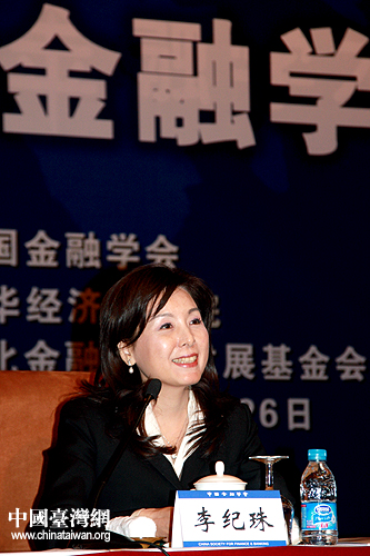 李紀珠以臺灣金融代表團首席顧問的身份在研討會閉幕式上進行發(fā)言。她表示:在兩岸實體經(jīng)濟聯(lián)系愈發(fā)緊密的背景下,雙方金融合作已是大勢所趨。兩岸間對于加速金融監(jiān)理機制的建立已有強烈共識。希望雙方盡早建立金融監(jiān)管制度,為兩岸金融合作實現(xiàn)突破性進展、攜手對抗全球金融危機奠定堅實基礎(chǔ)。