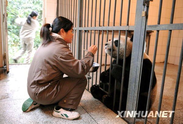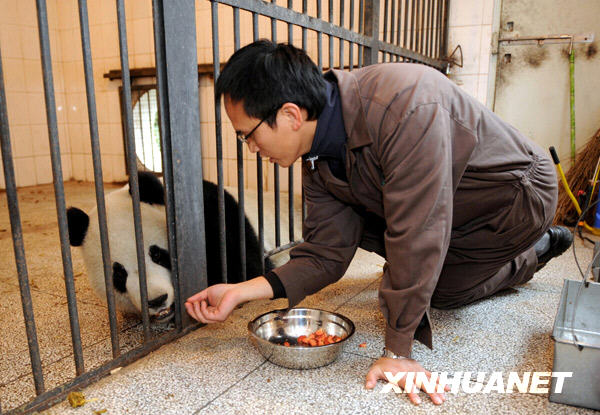 從2008年10月開始,臺(tái)北木柵動(dòng)物園的3名飼養(yǎng)員分兩批來(lái)到中國(guó)保護(hù)大熊貓研究中心四川雅安碧峰峽基地,學(xué)習(xí)大熊貓飼養(yǎng)技術(shù)。目前,他們和贈(zèng)臺(tái)大熊貓“團(tuán)團(tuán)”“圓圓”已經(jīng)建立感情,基本掌握了大熊貓飼養(yǎng)技術(shù)。新華社記者陳燮攝
