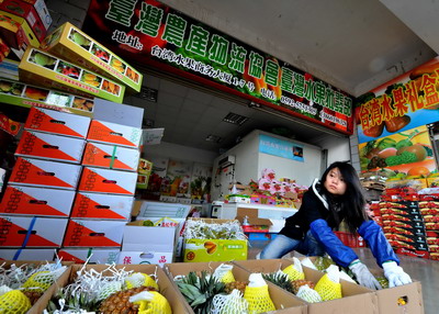 1月16日,在廈門(mén)中埔臺(tái)灣水果集散中心,商家將臺(tái)灣水果分裝銷售。 新華社記者 張國(guó)俊攝