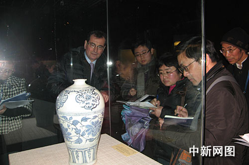 圖為臺(tái)北鴻禧美術(shù)館館長(zhǎng)詹姆斯·史彬士介紹元代青花牡丹紋梅瓶。作 者:艾啟平