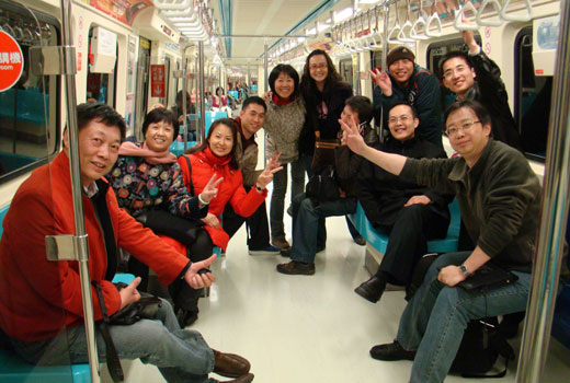 圖為除夕之夜,大陸駐臺記者在采訪歸來的捷運列車內(nèi)合影留念。圖為新華社記者李凱、王妍,人民日報駐臺記者吳亞明、陳曉星,中央人民廣播電臺記者張浩、謝治國,中央電視臺記者殷捷、陳軒石,東南衛(wèi)視記者葉青林、黃晟,福建日報記者林娟、翁之光。