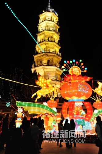二月四日晚,披上節(jié)日盛裝、頗具歷史的福州市馬尾羅星塔,與周圍剛剛亮燈的“鼓舞兩馬”、“兩馬同春”等大型花燈交相輝映。