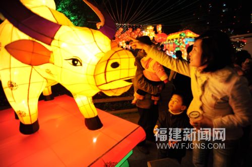 圖為市民津津樂道地在福州馬尾羅星塔公園欣賞“牛轉乾坤”大型花燈。