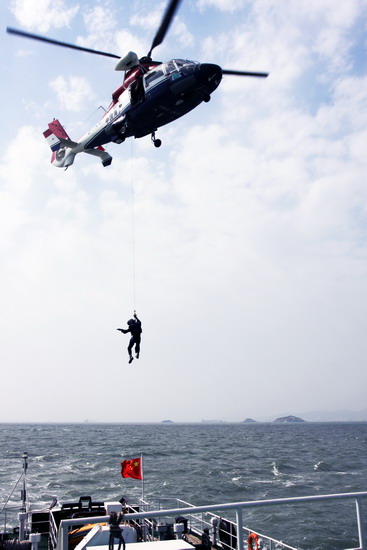 鎮(zhèn)海角既是廈門港的入口,又是兩岸直航航線的必經(jīng)之地。25日下午2時(shí)30分,東海第二飛行隊(duì)救助直升機(jī)B7106與福建省最大執(zhí)法公務(wù)船海巡132號(hào)在鎮(zhèn)海角處會(huì)合,并在此展開船舶與飛機(jī)海上配合救生演練。演練模擬高海況下出現(xiàn)的險(xiǎn)情,展開人命救助和應(yīng)急通訊聯(lián)絡(luò)等科目的演練。