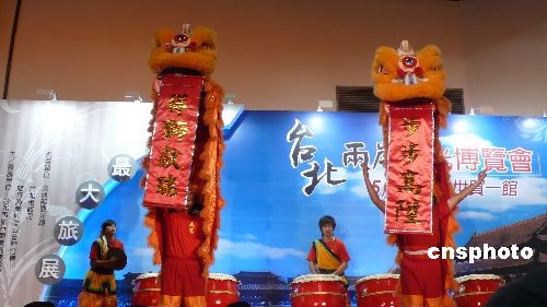鑼鼓喧天的迎賓獅舞中,臺北兩岸觀光博覽會于臺北世貿一館開幕。來自大陸十一個省市的旅游業(yè)者在館內積極向臺灣民眾推介大陸旅游資源。