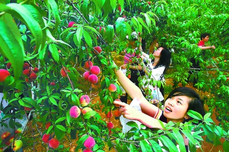 5月22日,幾位福州游客在閩侯龍臺山生態(tài)園桃林里采摘臺灣平地水蜜桃。前兩年,龍臺山引種了臺灣平地水蜜桃品種100多畝,今年迎來豐收,預計產(chǎn)量將達2萬公斤。這是閩臺農(nóng)業(yè)交流的又一成果。記者 祝敏松 攝