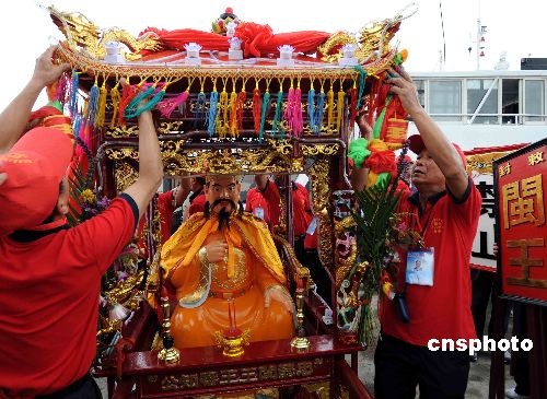 中新社福州六月二十八日電(記者 劉可耕)二十八日下午,由福州晉安區(qū)“閩臺(tái)王審知研究會(huì)”組織的福州市閩王金身巡安臺(tái)灣暨宗親文化交流訪問團(tuán)一行圓滿結(jié)束為期十天的閩王金身首次跨海巡安臺(tái)灣本島交流活動(dòng),搭乘“金龍輪”經(jīng)“兩馬”航線返回福州。