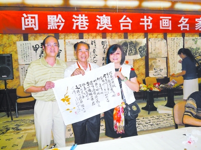 濃黑的墨跡通過(guò)一管狼毫行走在米白的宣紙上,一行行遒勁的字隨之展現(xiàn)眼前,這是一首意韻幽遠(yuǎn)的詩(shī),揮豪者是臺(tái)灣水墨畫(huà)家、書(shū)法家李轂?zāi)Γㄗ蠖,站在李先生邊上幫忙拿著宣紙的正是?shī)作者臺(tái)灣著名女詩(shī)人古月(右一)。場(chǎng)景為福建省畫(huà)院的一樓展廳,時(shí)值秋分,展廳墻上那貼得滿滿當(dāng)當(dāng)?shù)臅?shū)法、繪畫(huà)作品,顯示的正是藝術(shù)豐收的景象。這是“閩黔港澳臺(tái)書(shū)畫(huà)名家藝術(shù)精品聯(lián)展”在福州舉行的一幕。