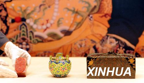 臺(tái)北故宮博物院10月2日特意舉行開(kāi)箱記者會(huì),展示3件來(lái)自北京的展品,包括“為君難”壽山石螭鈕長(zhǎng)方印、銅胎畫(huà)琺瑯纏枝蓮紋六孔瓶和描金彩漆包袱式紋長(zhǎng)方盒。