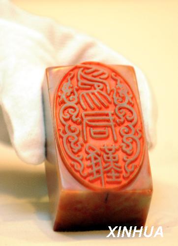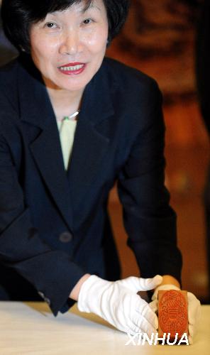 臺(tái)北故宮博物院院長(zhǎng)周功鑫展示來(lái)自北京故宮的清雍正時(shí)期“為君難”雕螭長(zhǎng)方印。新華社發(fā)(吳景騰 攝)