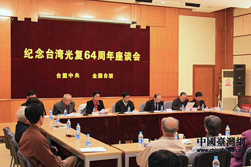 由臺盟中央、全國臺聯(lián)共同舉辦的“紀(jì)念臺灣光復(fù)64周年座談會”現(xiàn)場。(中國臺灣網(wǎng) 董潔/攝)