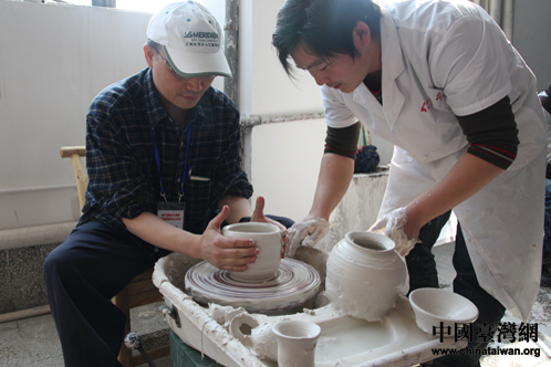 雖然無法親身參與釉下五彩瓷燒制的全過程,但是臺(tái)灣媒體朋友們還是享受了格外的待遇,嘗試了泥坯形狀的制作。來自臺(tái)灣中時(shí)集團(tuán)的記者小齊成為了第一個(gè)吃螃蟹的人,轉(zhuǎn)盤上細(xì)細(xì)的泥坯隨著他手指間的力度改變著姿態(tài)。在享受與泥坯融為一體的樂趣同時(shí),他也坦言,這項(xiàng)工作看著容易,實(shí)際操作卻很不好把握。對(duì)于大師們?cè)O(shè)計(jì)的那些造型別致、工藝繁瑣的瓷器,他表示由衷的佩服。(記者 陳寧)