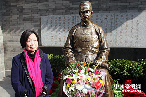 辜嚴(yán)倬云為其祖父嚴(yán)復(fù)的銅像雕塑獻(xiàn)上鮮花(中國臺灣網(wǎng) 董潔 攝)