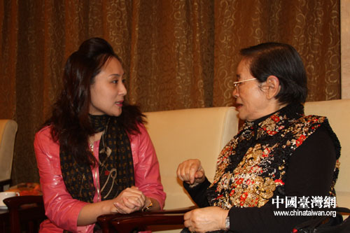 出席海峽兩岸京劇藝術(shù)論壇的臺灣海基會前董事長辜振甫遺孀、臺灣中華婦聯(lián)總會主任委員辜嚴(yán)倬云,在兩岸京劇票友聯(lián)誼活動現(xiàn)場演唱《鎖麟囊》選段春秋亭。(中國臺灣網(wǎng) 董潔 攝)