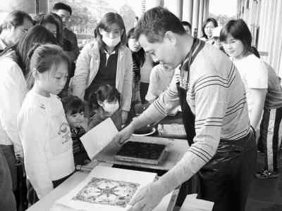 和善的馬習欽教得特別認真。他先給練習制作的孩子系上圍裙,然后教他們對版、套版、刷版,爾后,一張色彩明亮、透著喜氣的胖娃娃年畫就這樣印出來了。孩子們學(xué)得興致勃勃,也吸引了一些大人前來一試身手。