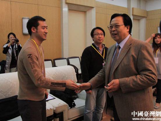 圖為原中共河南省委書(shū)記徐光春與臺(tái)灣媒體記者親切握手(中國(guó)臺(tái)灣網(wǎng) 徐維彬 攝)