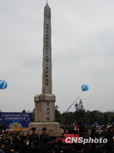 當(dāng)日南寧,天空陰云彌漫,冷風(fēng)蕭蕭。上午九時(shí)三十分,身著深色長(zhǎng)衫、胸前佩戴黃菊的中國(guó)全國(guó)人大常委會(huì)副委員長(zhǎng)、民革中央主席周鐵農(nóng),中國(guó)國(guó)民黨副主席蔣孝嚴(yán),海協(xié)會(huì)副會(huì)長(zhǎng)王在希等來(lái)到昆侖關(guān)戰(zhàn)役陣亡將士紀(jì)念塔前依次站列,公祭大典正式開始。