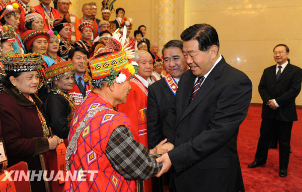 12月21日,中共中央政治局常委、全國政協(xié)主席賈慶林在北京人民大會堂會見臺灣少數(shù)民族代表人士訪問團一行。新華社記者黃敬文攝