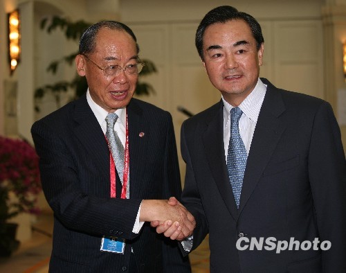 中共中央臺辦、國務院臺辦主任王毅4月10日在海南博鰲為前來出席博鰲亞洲論壇2010年年會的臺灣兩岸共同市場基金會最高顧問錢復一行舉辦招待酒會。 中新社發(fā) 王辛莉 攝