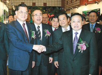 “湖北(武漢)臺(tái)灣周”開幕式暨鄂臺(tái)經(jīng)貿(mào)文化交流與合作論壇昨天揭幕,湖北省委書記羅清泉(右二)、國(guó)民黨榮譽(yù)主席連戰(zhàn)(左一)、吳伯雄(左二)及臺(tái)灣工總理事長(zhǎng)陳武雄(右三)、遠(yuǎn)東集團(tuán)董事長(zhǎng)徐旭東(右四)等企業(yè)界領(lǐng)袖參與活動(dòng)。圖片來源:臺(tái)灣《經(jīng)濟(jì)日?qǐng)?bào)》