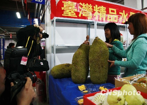 4月26日,在河北正定縣小商品博覽會(huì)上,300個(gè)家臺(tái)企的數(shù)千種商品亮相。在臺(tái)灣展區(qū)展銷的水果、小食品、飾品、服裝等特色商品受到游人歡迎。圖為來自寶島臺(tái)灣的精品水果“菠蘿蜜”其碩大的體形吸引了媒體的眼球。 中新社發(fā) 翟羽佳 攝