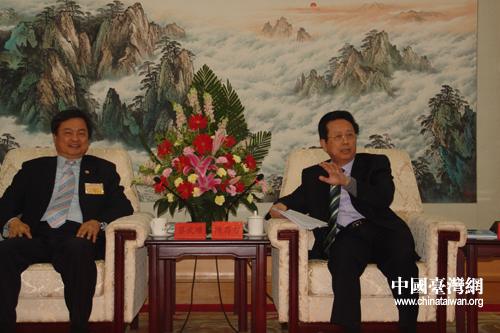 4月27日下午,中國和平統(tǒng)一促進(jìn)會(huì)與臺(tái)灣“一國兩制”研究協(xié)會(huì)訪問團(tuán)在京座談,全國人大常委會(huì)副委員長、中國和平統(tǒng)一促進(jìn)會(huì)副會(huì)長陳昌智(右)出席并發(fā)表講話。(中國臺(tái)灣網(wǎng) 楊麗 攝)