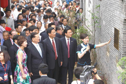 中央臺辦副主任陳元豐,海協會副會長李炳才,省委副書記、省政協主席劉偉,省委常委、宣傳部部長李群,中國國民黨榮譽主席連戰(zhàn)和夫人連方瑀等為泰和樓奠基。山東省委副書記、省政協主席劉偉在致辭中對棗莊市恢復重建臺兒莊古城工作給予了充分肯定,他說:“臺兒莊古城的重建是一件很有意義的事情,海峽兩岸交流基地的建設必將促進兩岸關系的和平發(fā)展!敝袊鴩顸h榮譽主席連戰(zhàn)則高度評價了中共棗莊市委、棗莊市人民政府為推動兩岸交流工作所做出的努力,他希望海峽兩岸交流基地深化交流,共同合作。