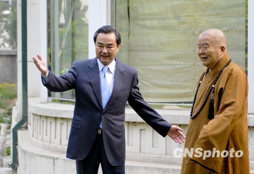 5月14日,國臺辦主任王毅邀請臺灣星云法師在北京釣魚臺國賓館的草坪上茶敘。 中新社發(fā) 廖攀 攝
