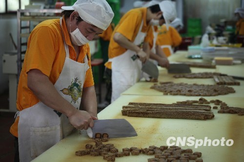 貢糖與鋼刀、金酒并稱為金門的三大伴手禮,備受來到金門旅游的大陸游客青睞。圖為金門的貢糖制作師傅正在切“豬腳糖”。 中新社發(fā) 羅欽文 攝