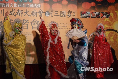5月20日,來自四川的演員在臺北的成都大廟會記者會上表演川劇變臉。名列大陸四大廟會之一的四川成都大廟會,首度跨海來臺展示四川最具代表性的非物質文化遺產,21日將在臺北登場。 中新社發(fā) 羅欽文 攝