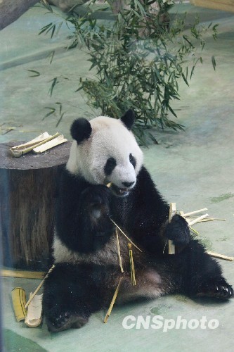 來(lái)臺(tái)1年有余、被眾觀者贊譽(yù)為“超可愛”的大熊貓團(tuán)團(tuán)圓圓正在臺(tái)北木柵動(dòng)物園的新光熊貓館過(guò)著和美的生活。臨近25日傍晚時(shí)分,工作人員說(shuō)已開始有發(fā)情跡象的圓圓常愛不停走動(dòng),幾乎沒(méi)有片刻停歇,她一會(huì)在水里沖涼,一會(huì)在地上打滾,一會(huì)又爬樹來(lái)一個(gè)驚險(xiǎn)倒立,引得觀者一陣陣叫好。圖為在隔壁和她分居的團(tuán)團(tuán)卻年少不諳性事,只顧自地大快朵頤大嚼竹子,全然不理不睬圓圓,令人忍俊不禁。 中新社發(fā) 閆曉虹 攝