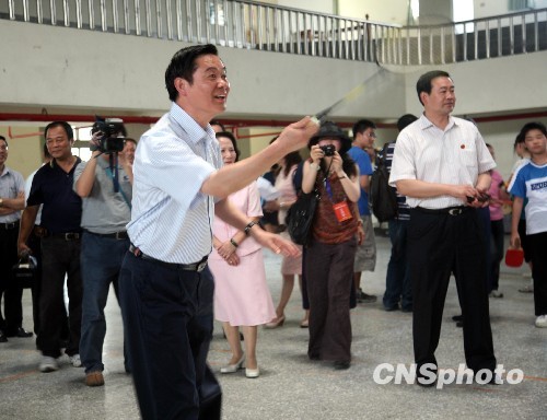 5月26日,在臺(tái)灣參訪的中共四川省委書(shū)記劉奇葆一行到“9·21”地震災(zāi)區(qū)南投縣參觀考察,圖為他走訪埔里小學(xué)時(shí)與學(xué)生打羽毛球。 中新社發(fā) 鄒輝 攝
