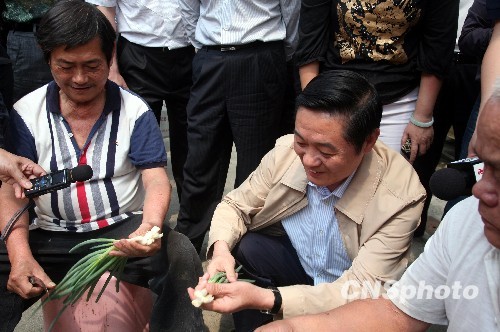 5月26日,中共四川省委書(shū)記劉奇葆一行到臺(tái)灣“9·21”地震災(zāi)區(qū)南投縣參觀考察,圖為他走訪安置震后老人的埔里鎮(zhèn)菩堤長(zhǎng)青村時(shí),蹲在地上與福利社區(qū)老人一起邊擇菜邊聊家常。 中新社發(fā) 鄒輝攝