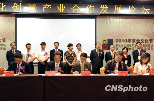 6月22日,2010年京臺(tái)文化節(jié)——京臺(tái)文化創(chuàng)意產(chǎn)業(yè)合作發(fā)展論壇暨“臺(tái)灣映像”項(xiàng)目洽談會(huì)在重新開張的北京臺(tái)灣會(huì)館舉行。臺(tái)灣的中華海峽兩岸經(jīng)濟(jì)貿(mào)易促進(jìn)會(huì),中華兩岸連鎖經(jīng)營(yíng)協(xié)會(huì)等10家臺(tái)灣行業(yè)組織和文化創(chuàng)意企業(yè)簽約入駐前門臺(tái)灣文化商務(wù)區(qū)!芭_(tái)灣映像”即前門臺(tái)灣文化商務(wù)區(qū)將于9月28日正式營(yíng)業(yè)。 中新社發(fā) 劉震 攝
