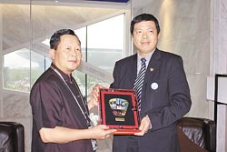 苗栗縣長劉政鴻(左)與12位縣議員參觀上海世博臺灣館,表達買下臺灣館的充分誠意,由臺灣館總館長葉明水致贈紀念品,紀念品正是一幅臺灣館天燈紀念徽章拼圖組。圖片來源:臺灣《旺報》