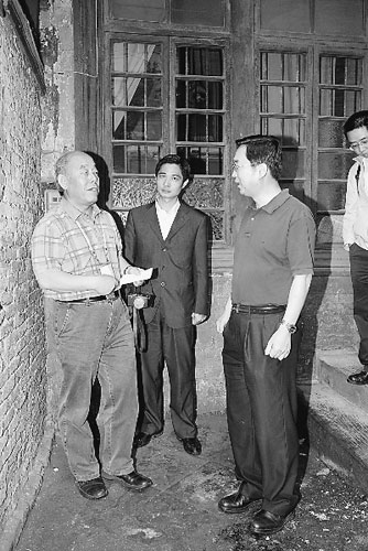 6月8日,在重走故宮文物南遷路途中,李文儒(左一)與當(dāng)?shù)匚奈飳<铱疾飚?dāng)年存放文物的貴州毛(光翔)公館。照片由故宮博物院提供