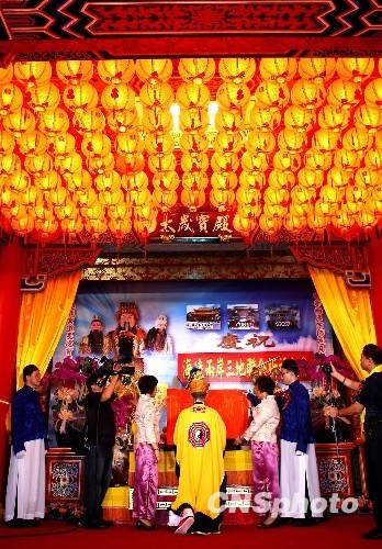 上午10時(shí)許,臺北指南宮鳴鐘鼓、奏道樂,大陸、香港和臺灣道界代表依序獻(xiàn)禮。