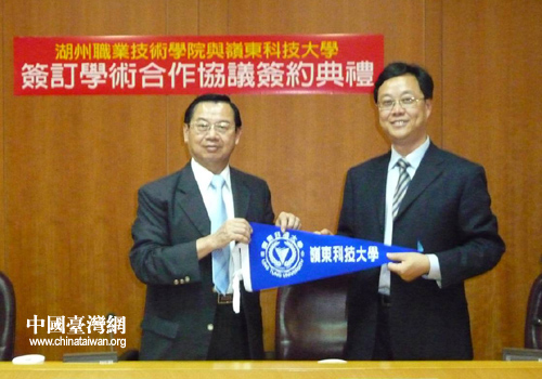 中國臺(tái)灣網(wǎng)7月2日湖州消息 日前,臺(tái)灣嶺東科技大學(xué)校長陳振貴與湖州職業(yè)技術(shù)學(xué)院院長胡世明簽訂合作協(xié)議,兩校正式結(jié)為姊妹學(xué)校。湖州職業(yè)技術(shù)學(xué)院的22名女生應(yīng)陳校長的邀請(qǐng),將于2010年9月13日至2011年1月14日期間赴臺(tái)灣進(jìn)行交流學(xué)習(xí)。期間,將在臺(tái)灣嶺東科技大學(xué)選修18-20學(xué)分的課程進(jìn)行學(xué)習(xí)。