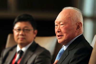 李光耀(前右)12日出席在新加坡舉行的首屆慧眼中國(guó)環(huán)球論壇,針對(duì)中美關(guān)系、中國(guó)政治經(jīng)濟(jì)發(fā)展發(fā)表看法。(來(lái)源:聯(lián)合早報(bào))
